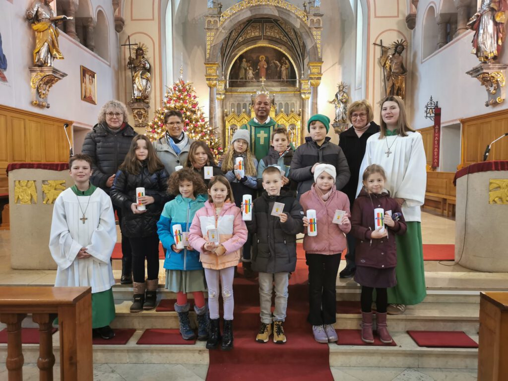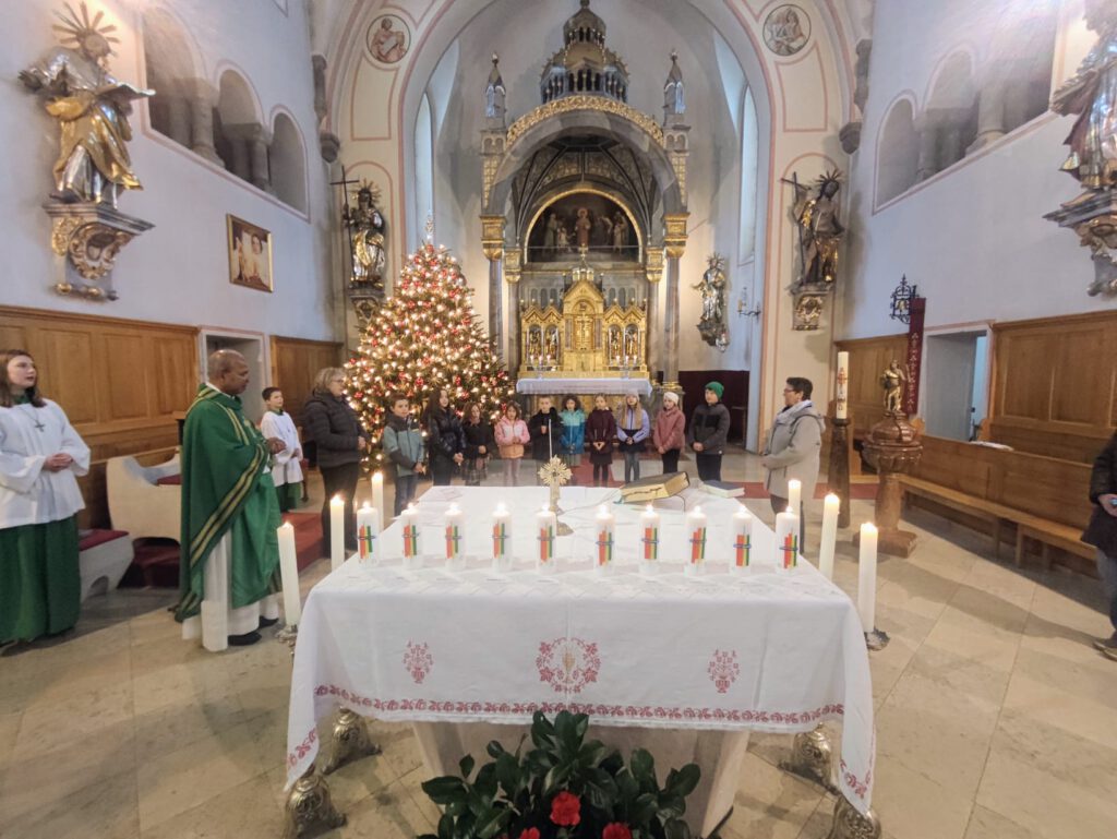 Nach der Einleitung, segnete Pfr. Soosai die Tischkerzen und lud die Erstkommunionkindern zum Altar ein und bat sie zu erklären wie man Licht der Welt sein kann. Die Erstkommunionkindern bildeten einen Halbkreis hinter dem Altar. Die Gottesdienstbesucher waren sehr begeistert, wenn die Kinder in einfachen Worten erklärten wie: „Wir leuchten, wenn wir freundlich sind. Wir können als das Licht Christi leuchten, wenn wir Gutes tun. Wir leuchten, wenn wir anderen helfen. Wir können als das Licht Christi leuchten, wenn wir mit anderen teilen und wenn wir anderen ein nettes Lächeln schenken. Wir leuchten, wenn wir hilfsbereit sind und wir für uns und andere beten und wenn sich dadurch so manche Dunkelheit etwas erhellt, wenn die Welt ein kleines bisschen menschlicher, liebevoller und heller wird, dann hast du viel dazu beigetragen, Licht für die Welt zu sein“ Nach jedem Satz, zündeten zwei Mütter die Tischkerze an.