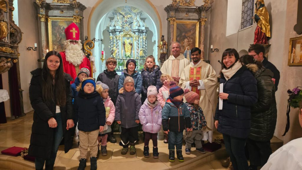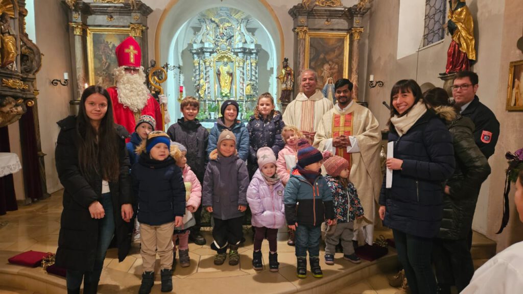 Das Fest begann mit einem Festgottesdienst in der Ortskirche St. Nikolaus mit Pfarrvikar Peter als Hauptzelebrant und BGR Pfarrer Antony Soosai als Konzelebrant. Der Gottesdienst stand unter dem Thema: “Sich freuen und Freude schenken, und wurde sehr stimmungsvoll von dem Männerchor “Miteinand” unter der Leitung von Max Frankl musikalisch begleitet.